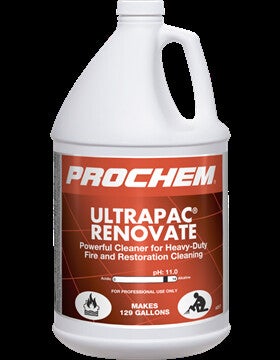 Formulated for the most difficult fire or water damage restoration jobs, Ultrapac Renovate is a highly concentrated extreme cleaner for heavy soils and charged particle soils such as soot contamination. This cationic cleaning agent can be used on most painted and unpainted surfaces, drywall, metals and other water-cleanable surfaces. Renovate contains no solvents that can damage sensitive surfaces and easily rinses without streaking.